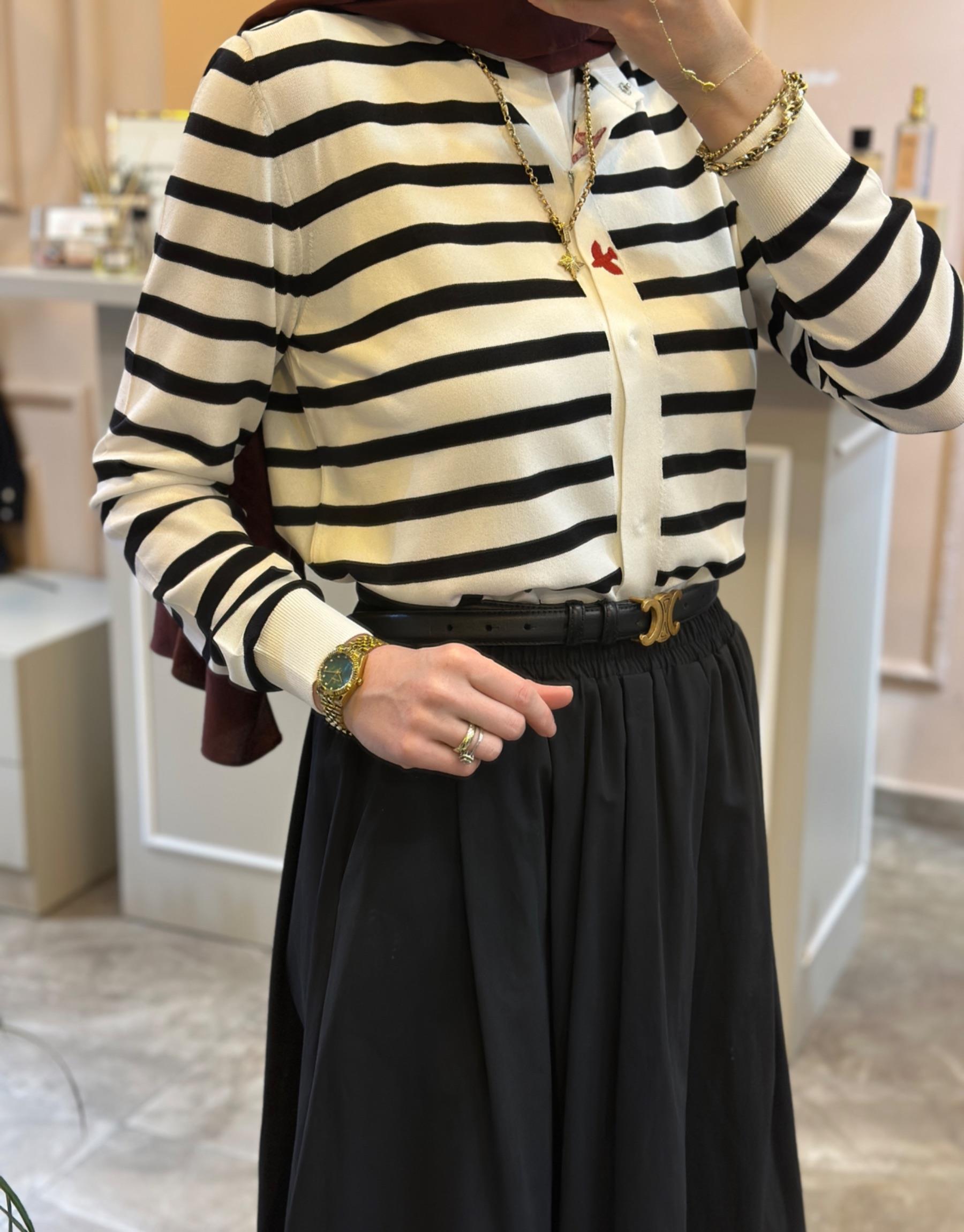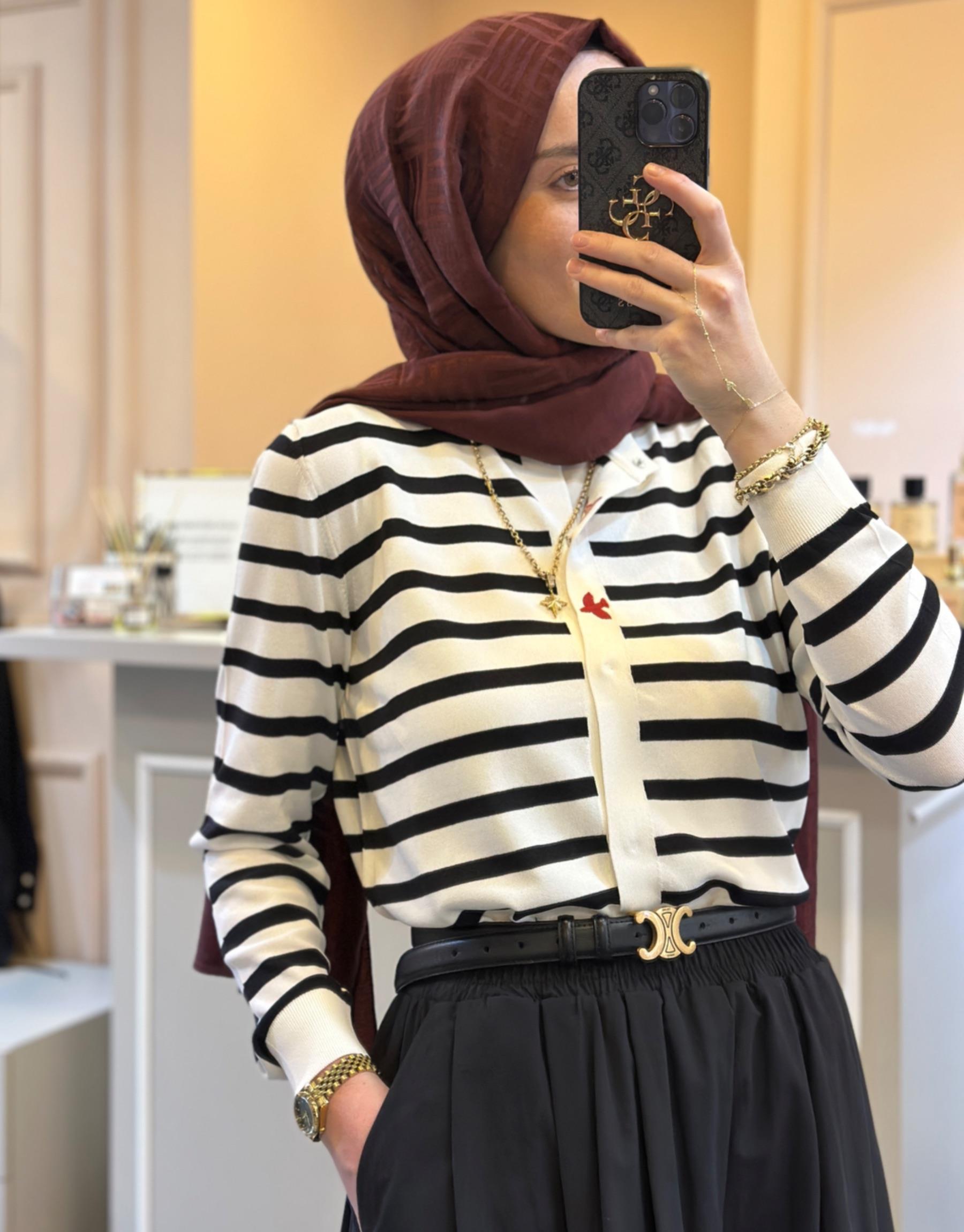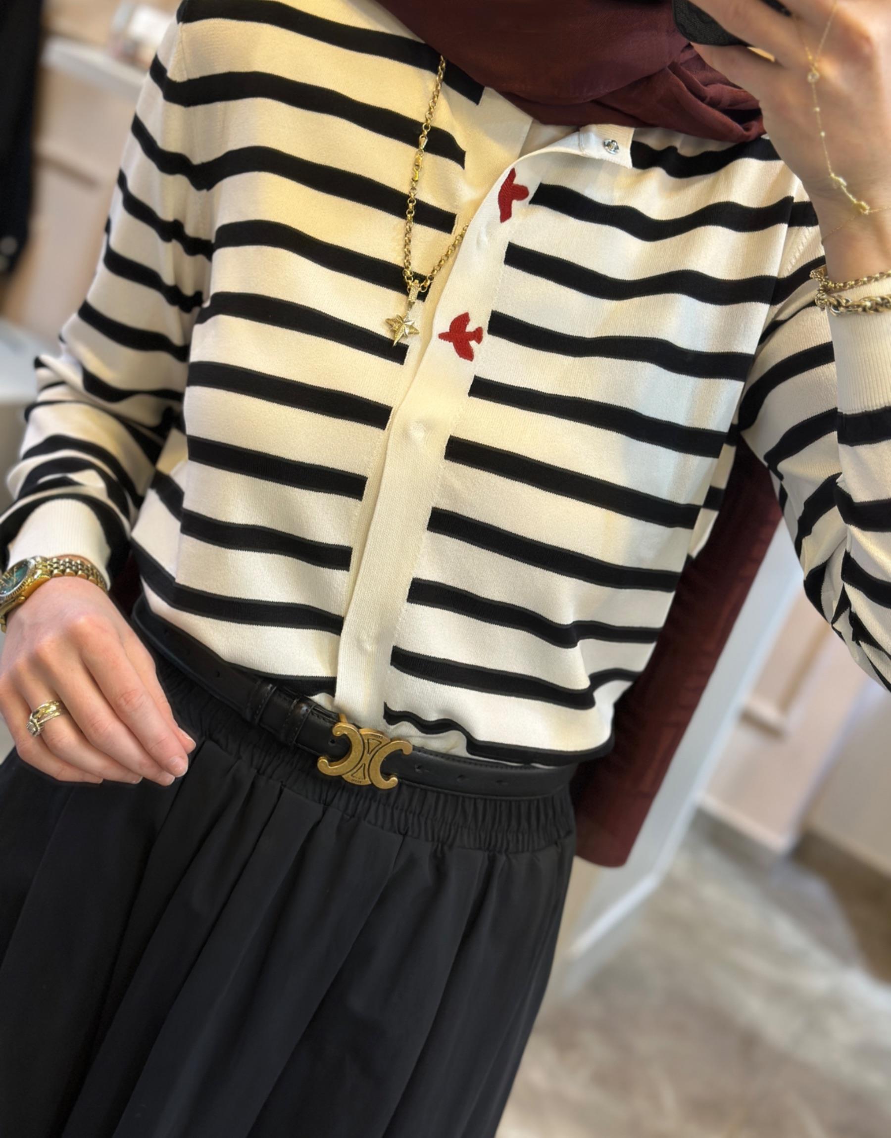 GHİSA Önü Kuş Motifli Çizgili Hırka Ekru-Siyah