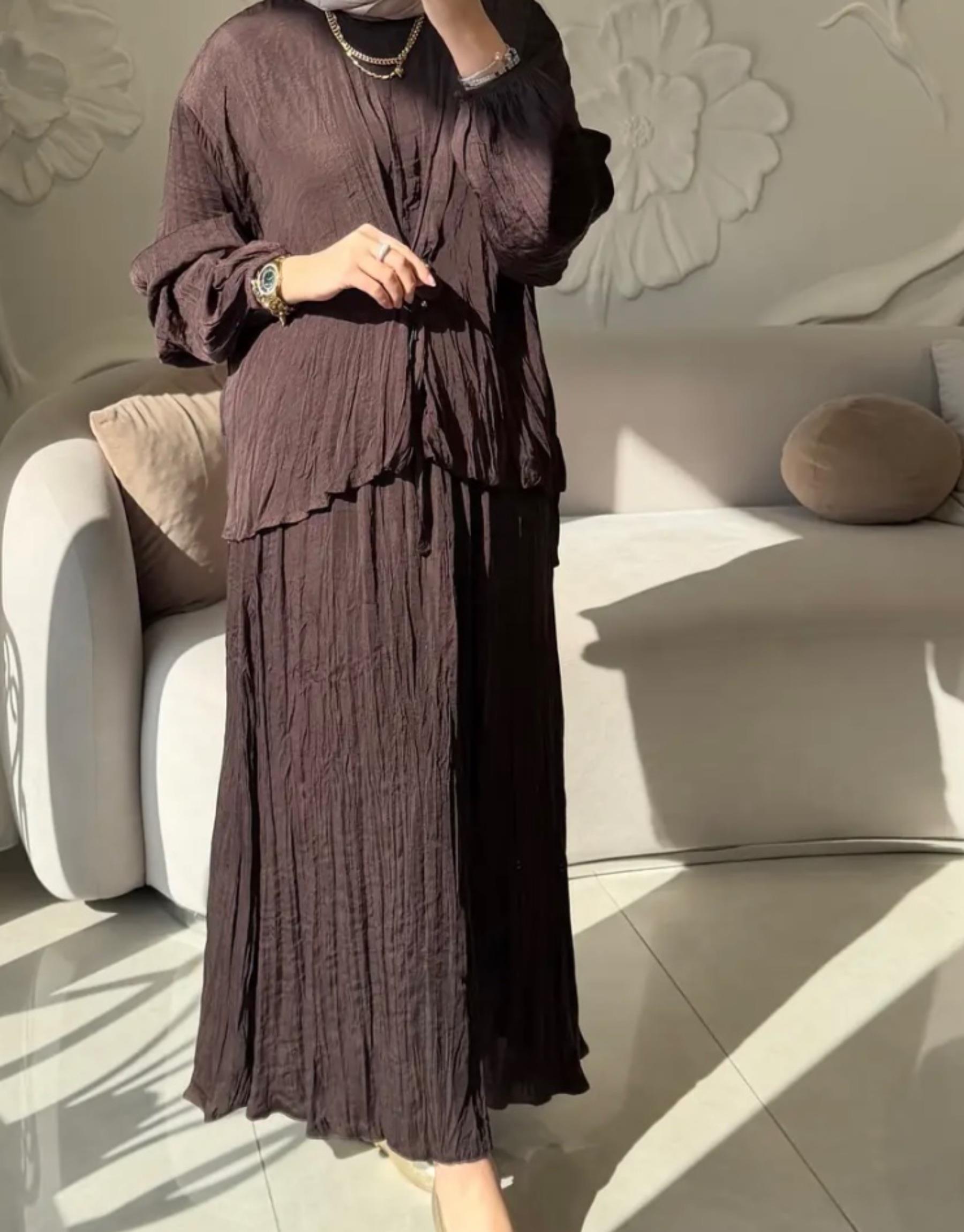 GHİSA BLUZU YANDAN DETAYLI ETEKLİ TAKIM Kahve