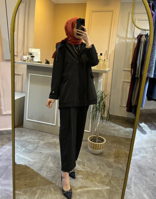 GHİSA ÖNÜ DANTEL İŞLEMELİ KAPŞONLU ÇİZGİLİ TAKIM Siyah