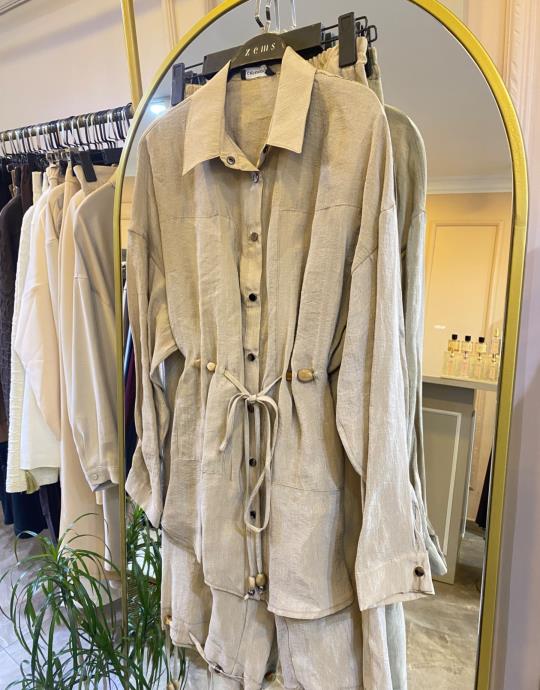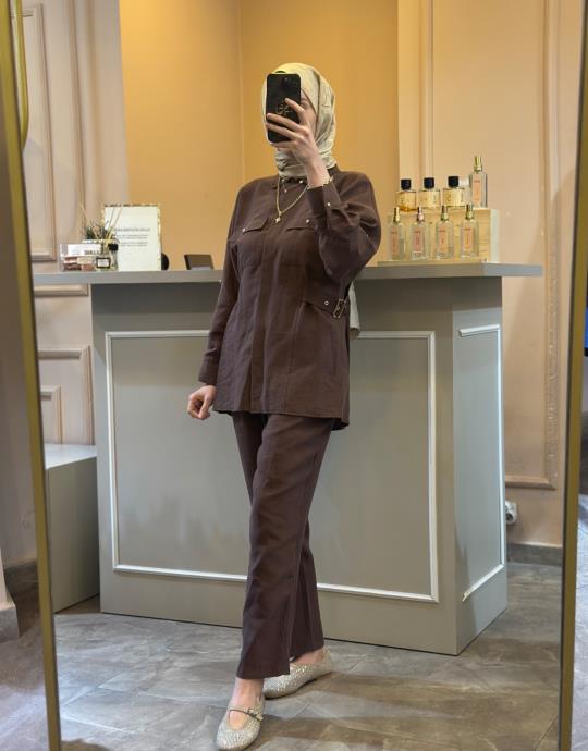 GHİSA BELDEN KEMER DETAYLI KETEN TAKIM Kahve