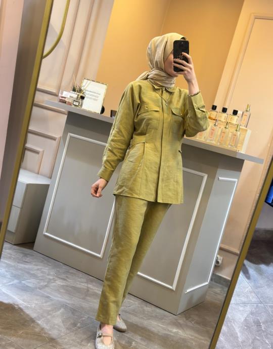 GHİSA BELDEN KEMER DETAYLI KETEN TAKIM Yeşil