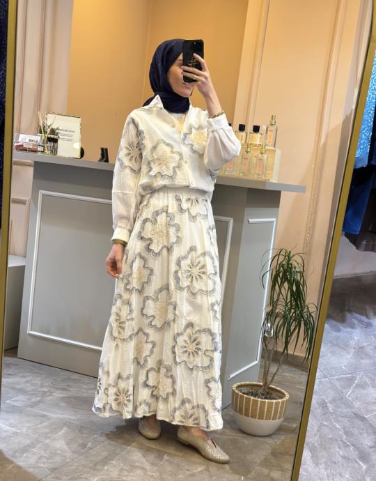 CEREMONY ÖNDEN SEDEF DÜĞMELİ ETEKLİ SİMLİ KETEN TAKIM Ekru