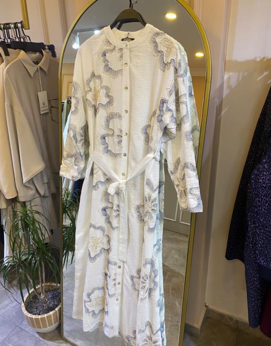 CEREMONY ÖNDEN DÜĞMELİ ÇİÇEK PAYETLİ KETEN ELBİSE Ekru