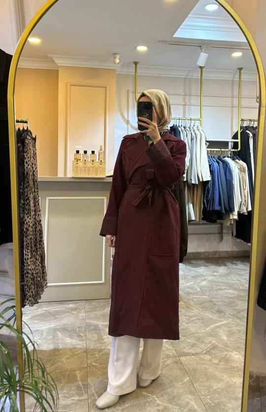 ARKASI KAPİTÖNE DETAYLI BELDEN KEMERLİ TRENÇKOT Bordo
