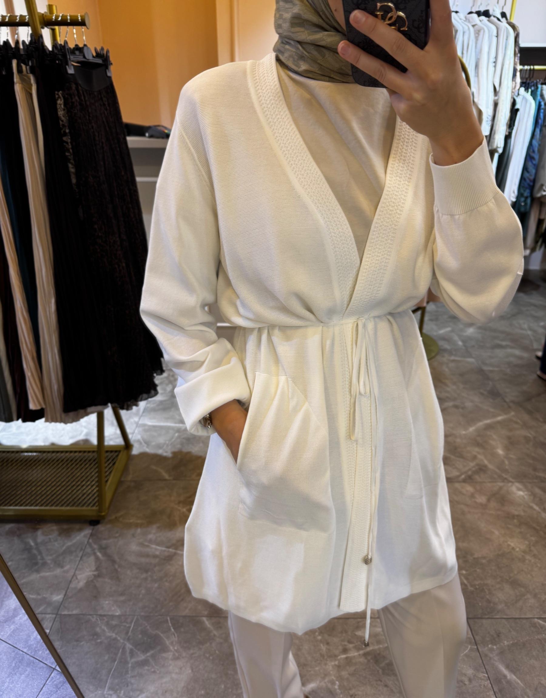 GHİSA Yakası Püsküllü Belden Kuşaklı Uzun İthal Hırka Siyah Beyaz