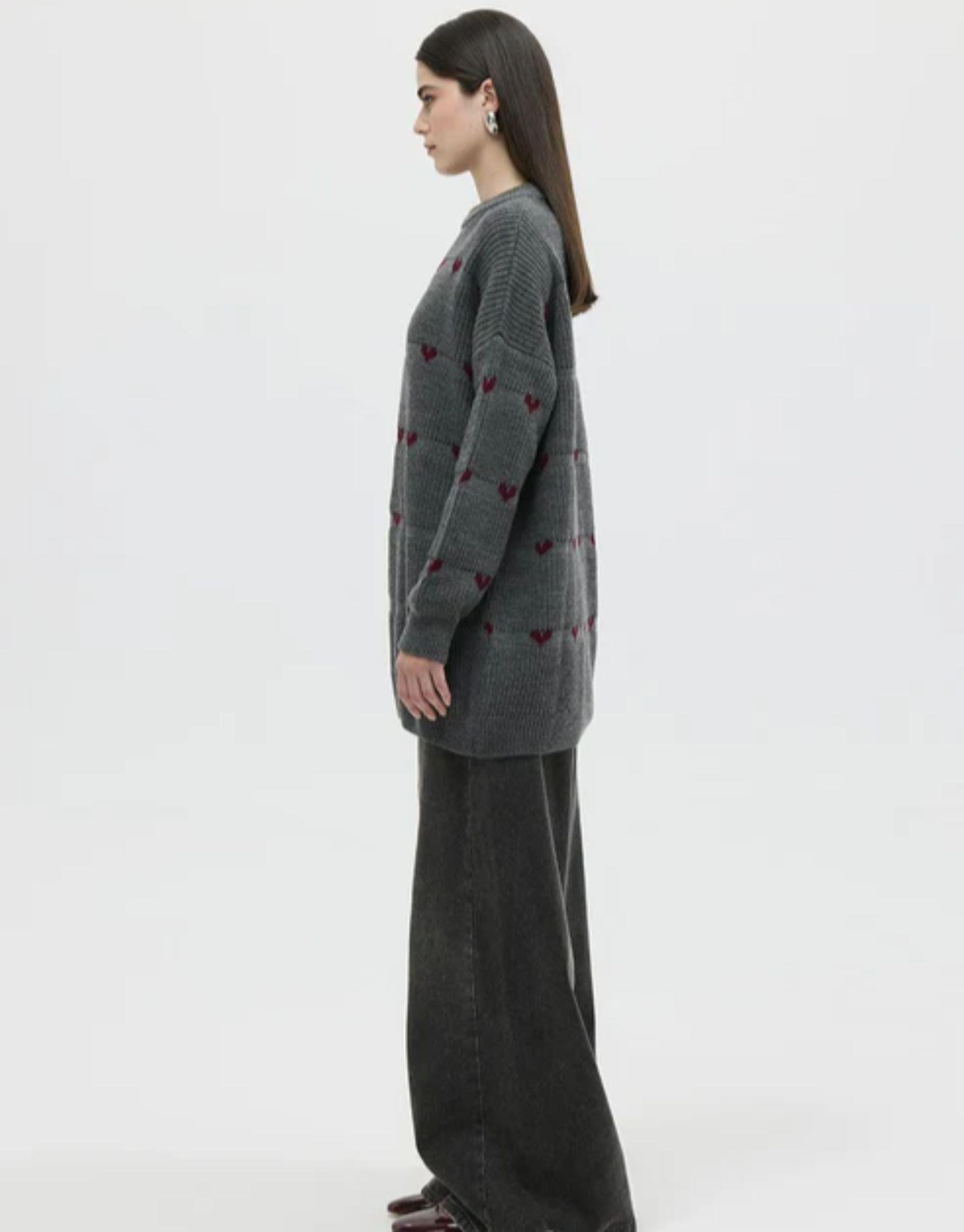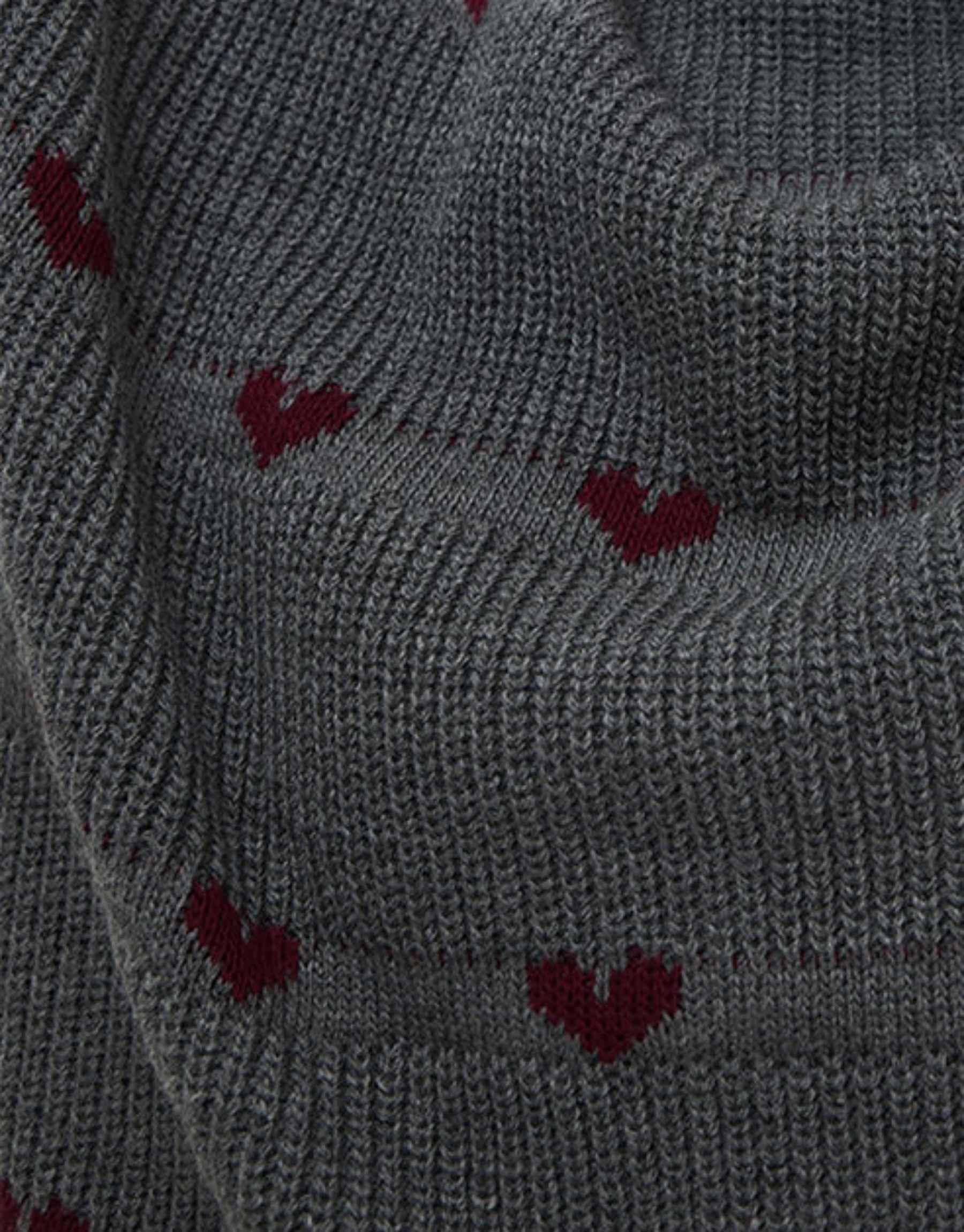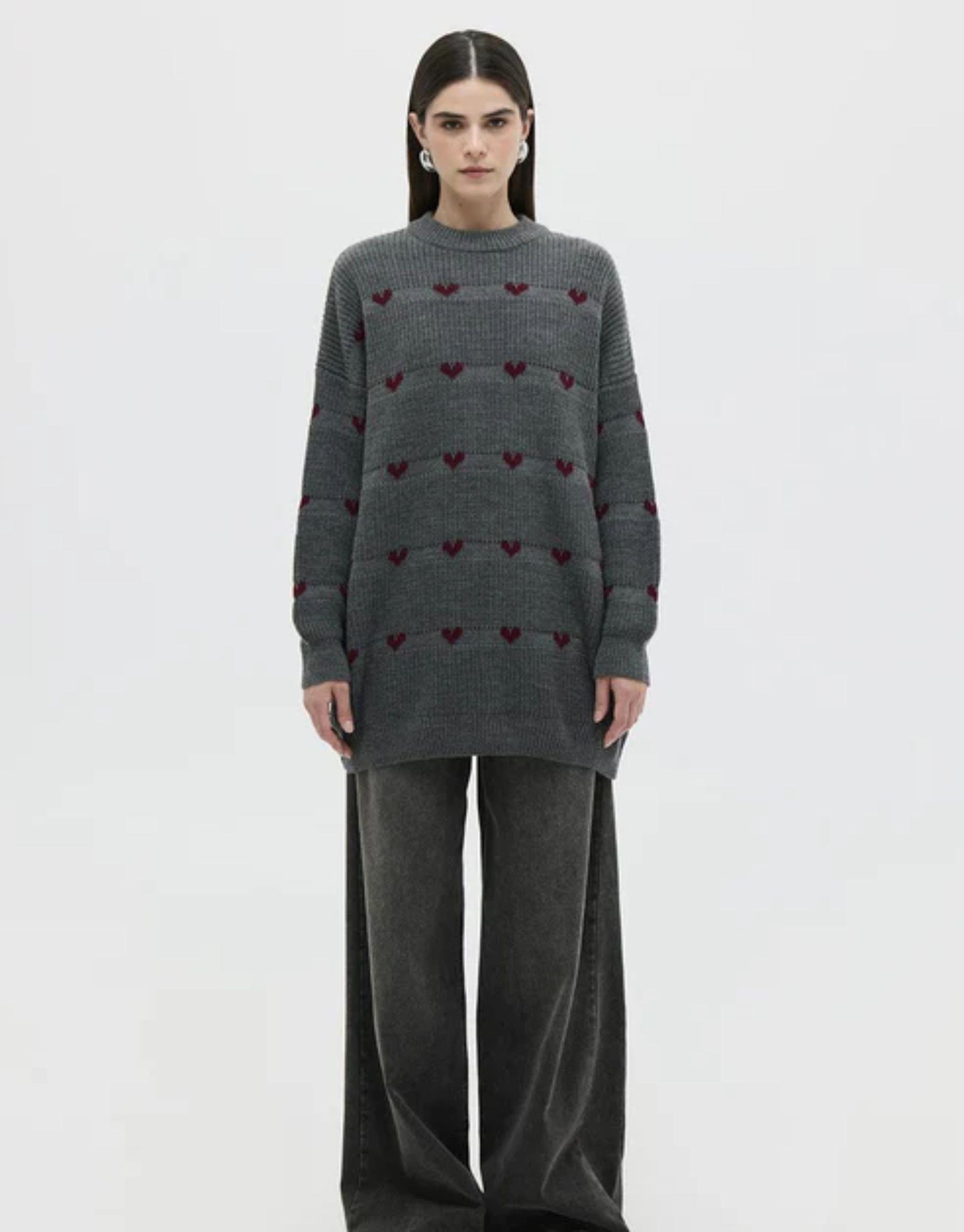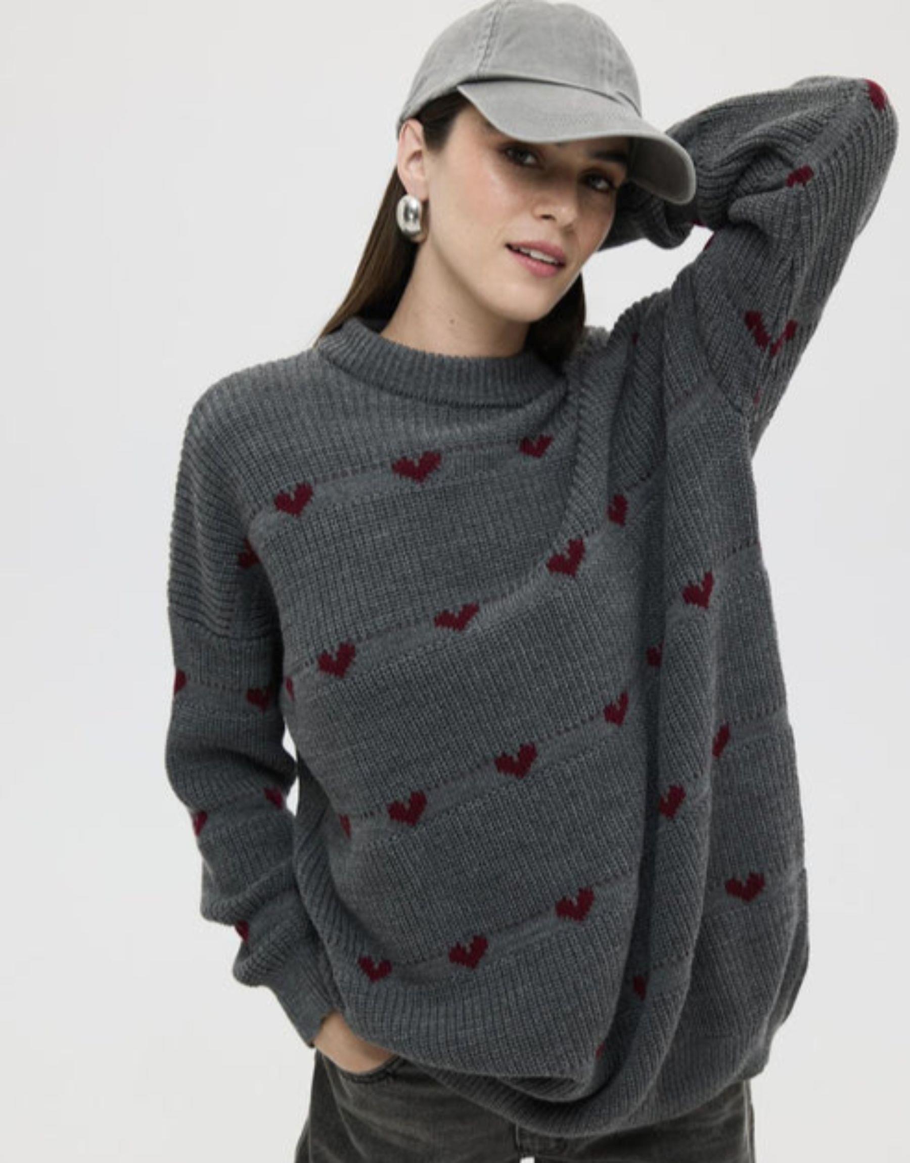 Kalp motifli triko kazak gri, zarif kalp motifleriyle dikkat çeker ve kış stiline romantik bir dokunuş katar. Yumuşak dokusu sayesinde soğuk günlerde sıcak tutar ve gün boyu konfor sağlar. Hem sade hem de şık bir görünüm sunan kalp desenleri, modern tasarımıyla kombinlerin vazgeçilmezi olur. Jean pantolonlarla ya da eteklerle kolayca tamamlanabilecek, zamansız bir parça.