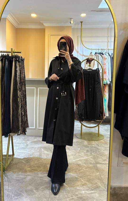 ARKASI KAPİTÖNE DETAYLI BELDEN KEMERLİ TRENÇKOT Siyah