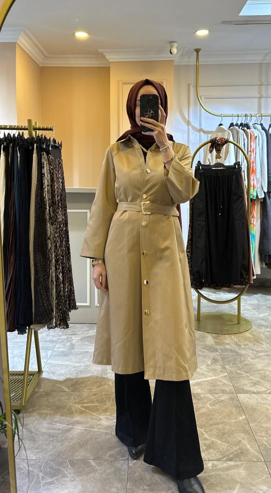 GHİSA ÖNÜ ÇIT ÇIT DETAYLI TRENÇKOT Camel