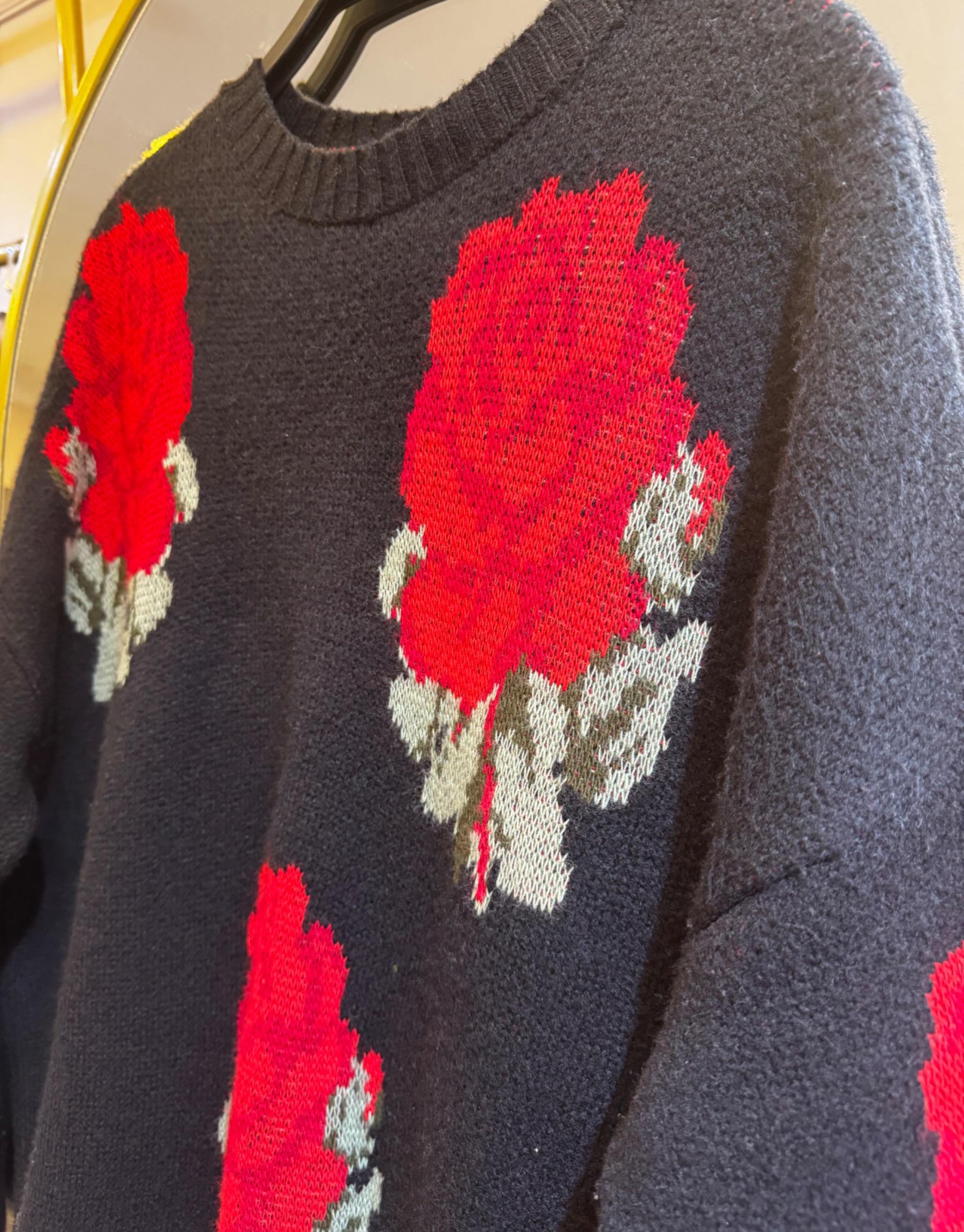 Desenli triko kazak siyah, gül motifleriyle süslenmiş yumuşak dokusu ve rahat kalıbıyla hem şık hem de konforlu bir seçenek sunar. Modern tasarımıyla dikkat çekerken, kışın soğuk günlerinde sıcak tutar ve stilinizi romantik bir dokunuşla tamamlar. İster pantolonlarla ister eteklerle kombinleyerek gün boyu rahatlık ve şıklığı bir arada yaşayın.