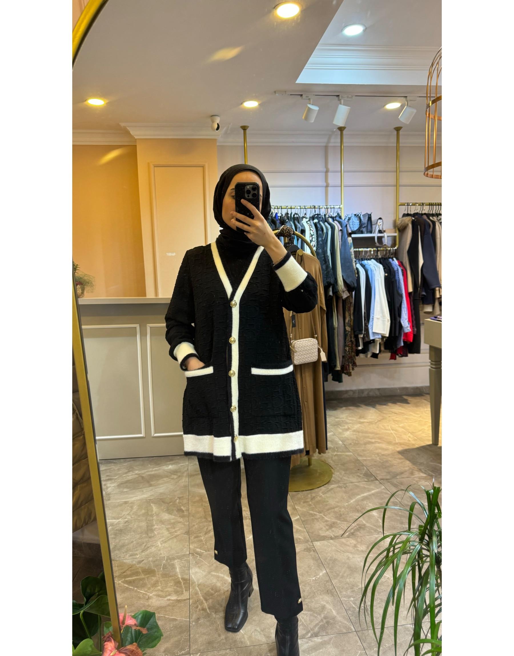 GHİSA Yakası Püsküllü Belden Kuşaklı Uzun İthal Hırka Siyah Beyaz