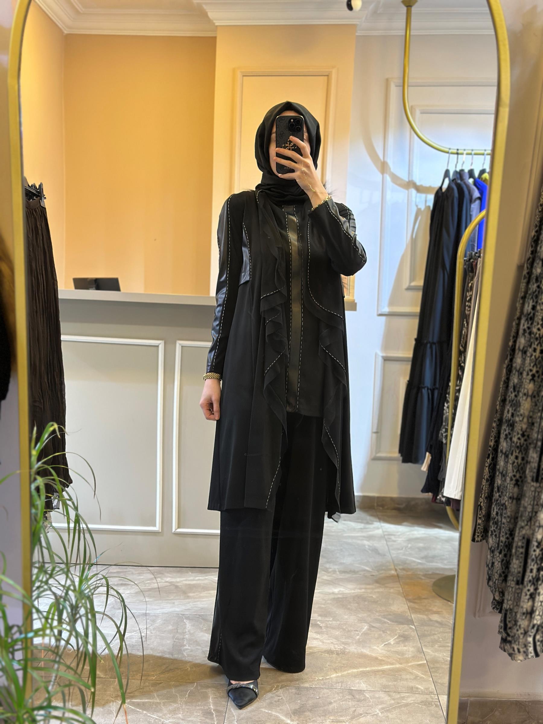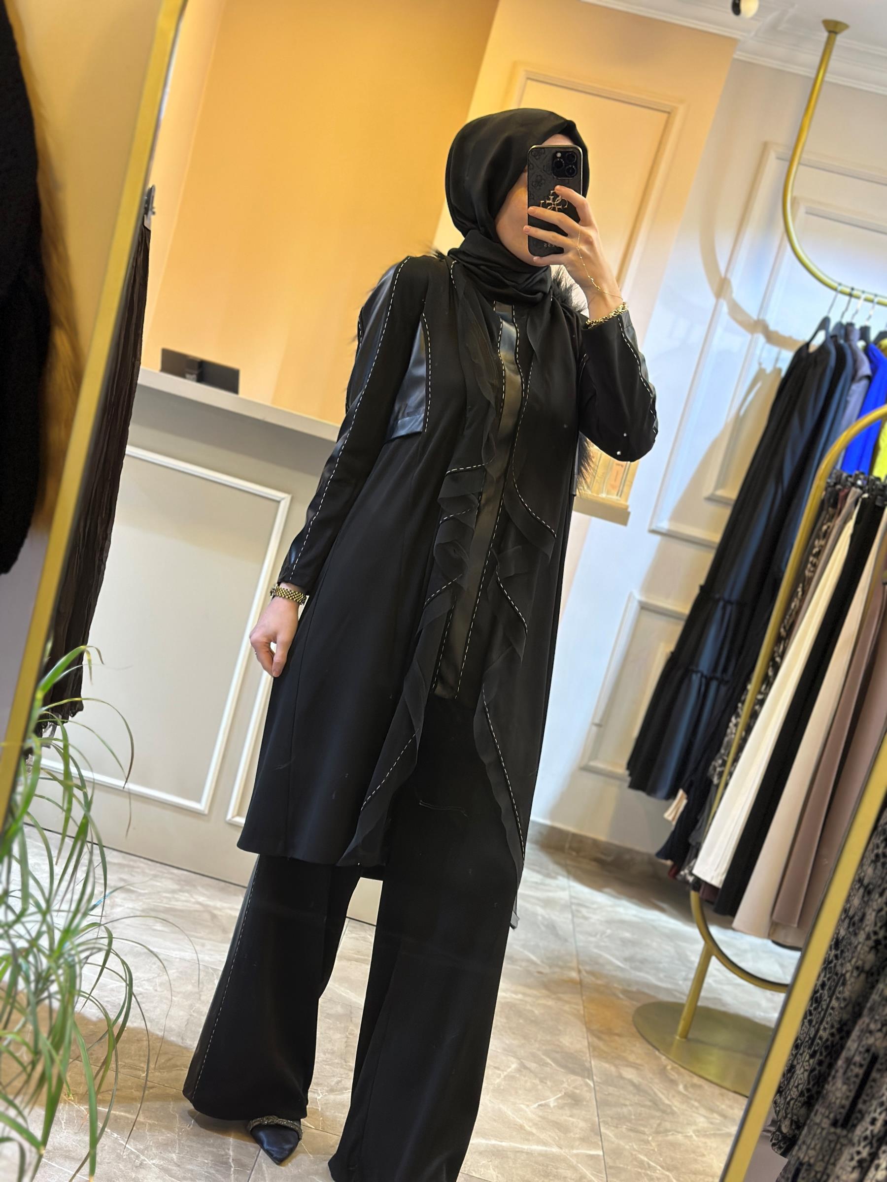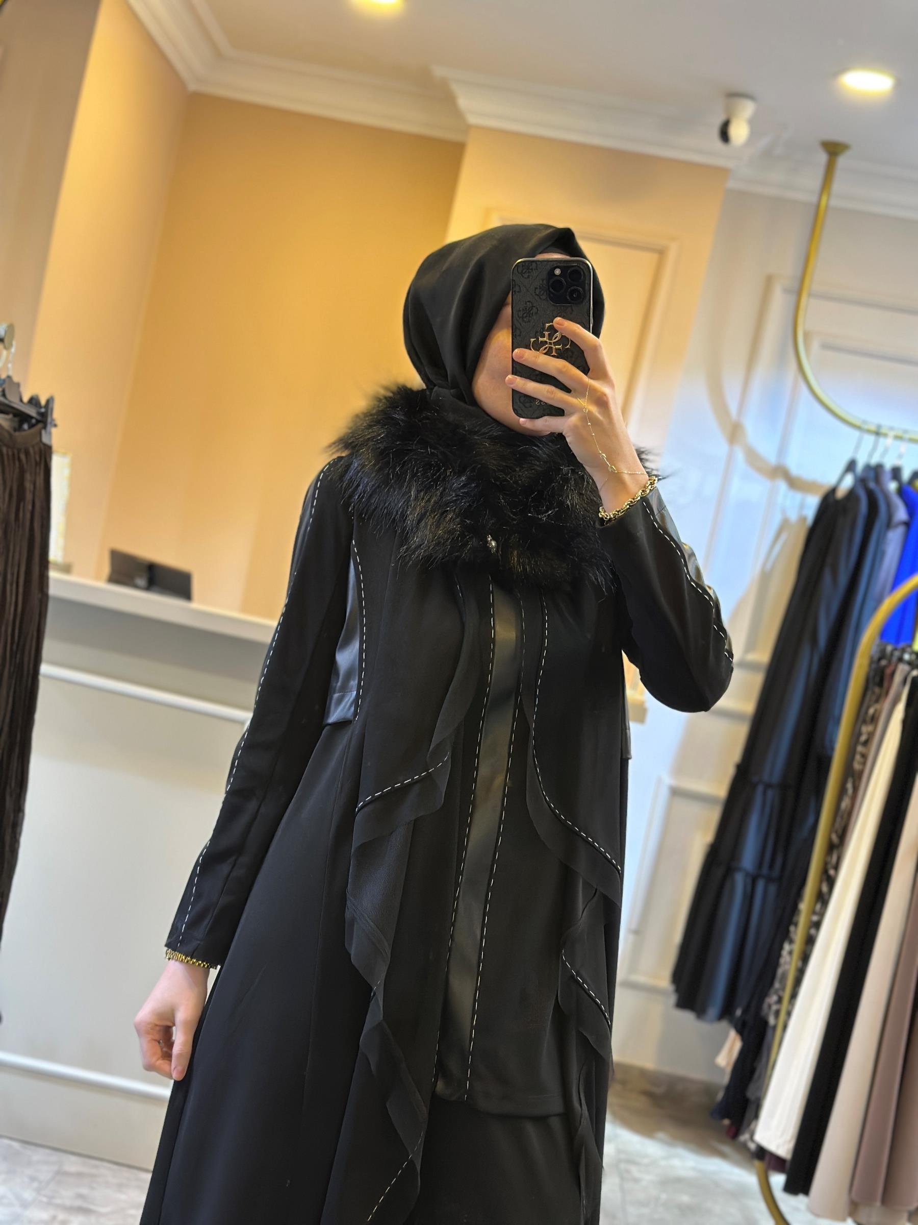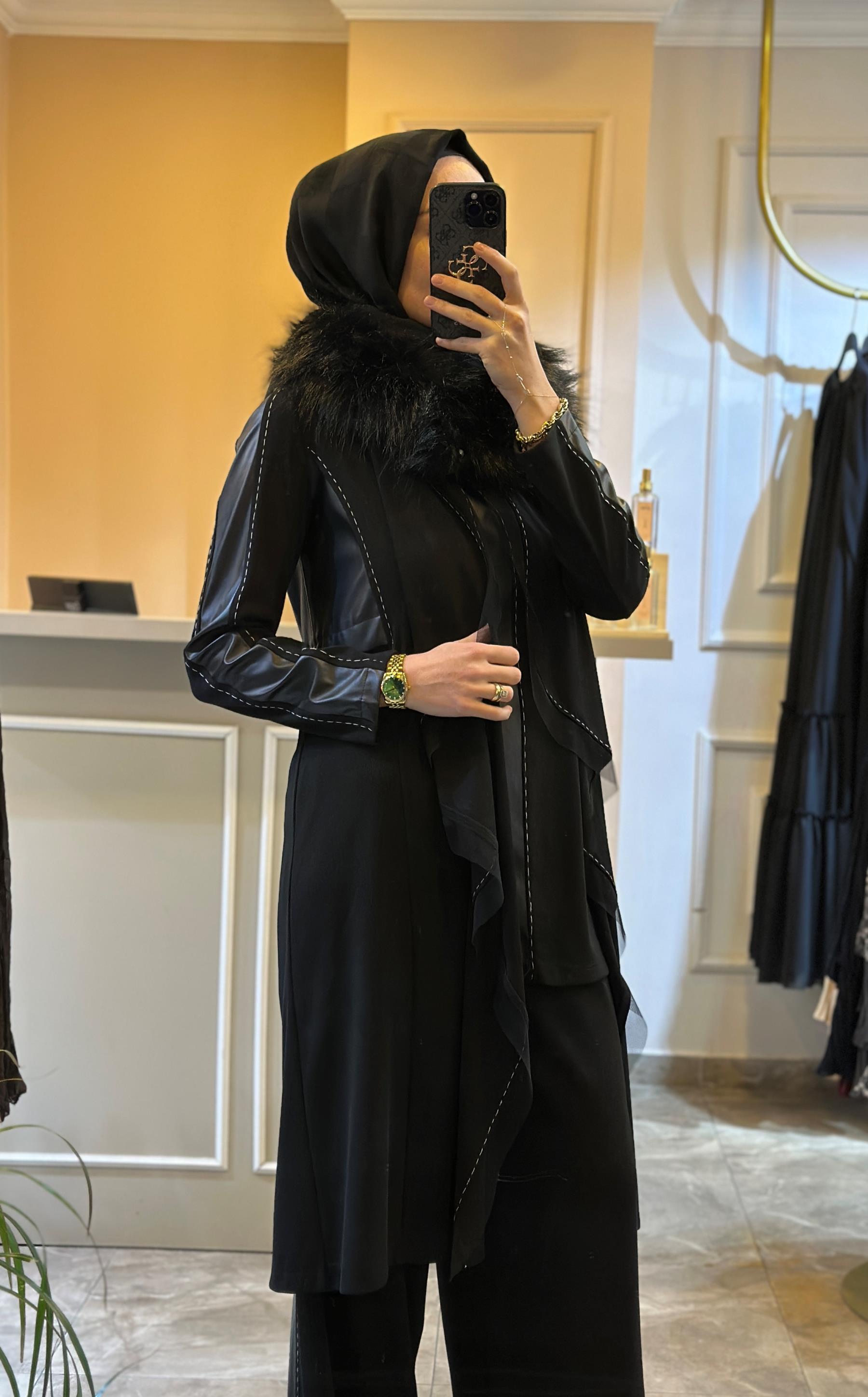 GHİSA YAKASI KÜRK VE DERİ DETAYLI ÜÇLÜ TAKIM | Ghisa