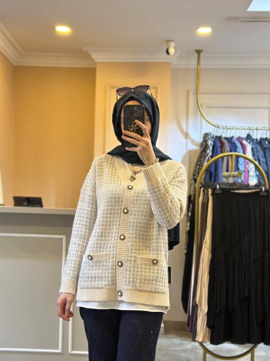 GHİSA Gümüş İp Geçişli Pullu V Yaka İthal Triko Hırka Bej